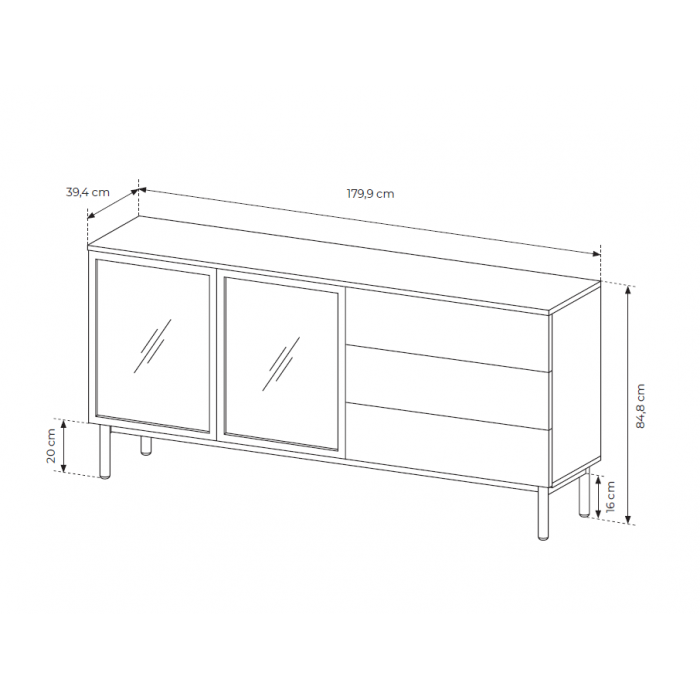 Die zweitürige Kommode verfügt über drei Schubladen, in denen sich eine Vielzahl von Gegenständen verstauen lässt. Das gehärtete Glas trägt zu ihrer Langlebigkeit bei, während die Rückseite des Möbels aus schwarzem HDF mit Keder in Eiche-Optik besteht, um eine einheitliche Ästhetik zu schaffen. Das Gesamtbild wird durch die hohen Holzbeine vervollständigt, die der Kommode Leichtigkeit und Eleganz verleihen.