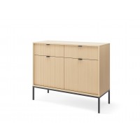 Der Korpus der Kommode besteht aus einer 16 mm dicken, strapazierfähigen Schichtstoffplatte, deren Kanten mit einer ABS-Kante geschützt sind, die das Möbel vor mechanischen Beschädigungen bewahrt. Die geriffelten Fronten sind aus hochwertigem MDF gefertigt. Ergänzt wird das Ganze durch minimalistische, gebürstete Griffe in Schwarz und einen stabilen, pulverbeschichteten Rahmen mit einem zusätzlichen fünften Bein zur Verstärkung der Struktur.