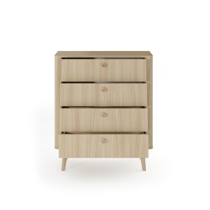 Die kompakte Kommode MILA mit vier geräumigen Schubladen ist das ideale Möbelstück für die Aufbewahrung von Kleidung, Wäsche oder Dokumenten. Sie ist aus strapazierfähiger laminierter Platte in Barista-Eiche mit Holzdetails gefertigt, die den natürlichen skandinavischen Charakter der Kollektion unterstreichen.