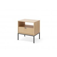 Połączenie naturalnego odcienia Dębu Vicenza z modnymi, ryflowanymi frontami nadaje meblowi lekkości i klasy. Kontrastujący, czarny stelaż z metalu wprowadza loftowy charakter, a delikatne, czarne uchwyty dopełniają całości. To mebel dla osób ceniących detale.